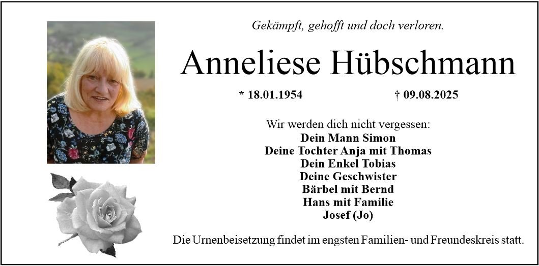 Anneliese Hübschmanngestorben am 9. August 2025